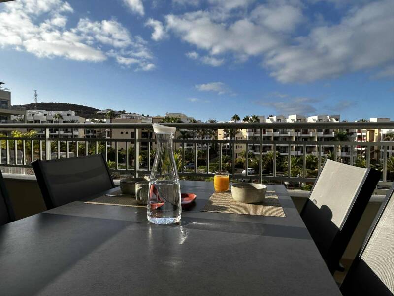 Zowel de woonruimte als de slaapkamer geven uit op een gezellig ruim terras (6m breed) met open zicht. Net boven de binnentuin en zijdelings zicht op het zwembad. Er is zo goed als het hele jaar door (gratis) parkeerplaats rond het complex.